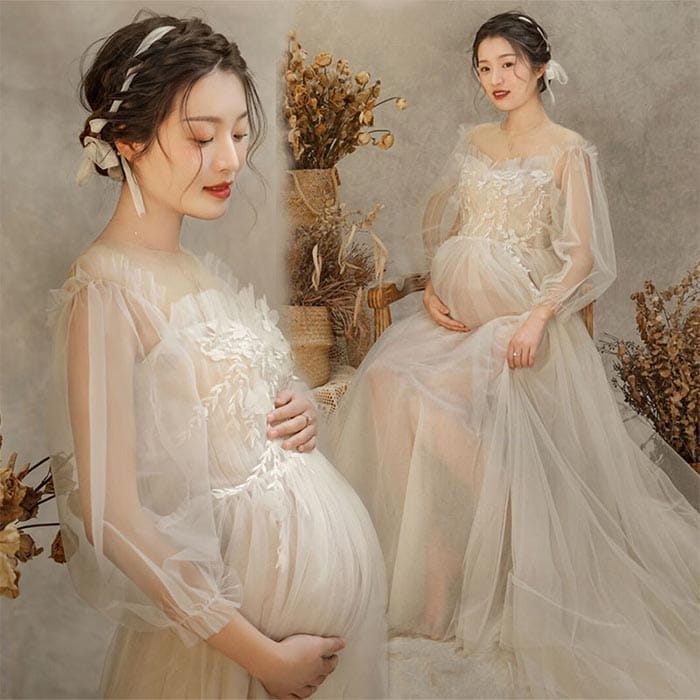 ワンピース マタニティ ドレス フォト シースルー レース 刺繍 長袖 マキシ 丈 ワンピ おしゃれ きれいめ エレガント 思い出 記念撮影 メモリーフォト 記念写真
