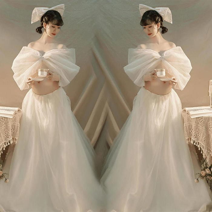 マタニティ フォト ドレス オフショルダー スカート セット リボン可愛い キュート 思い出 記念撮影 メモリーフォト 記念写真 ホワイト