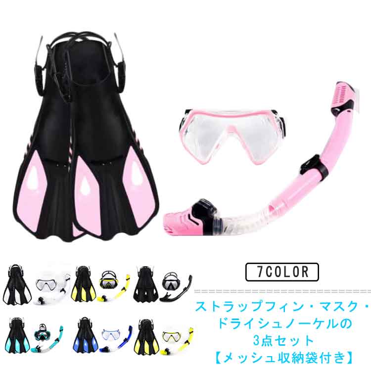 フィン 初心者 3点 マスク セット 足ひれ シュノーケリングマスク シュノーケル 収納袋付き ドライシュノーケル