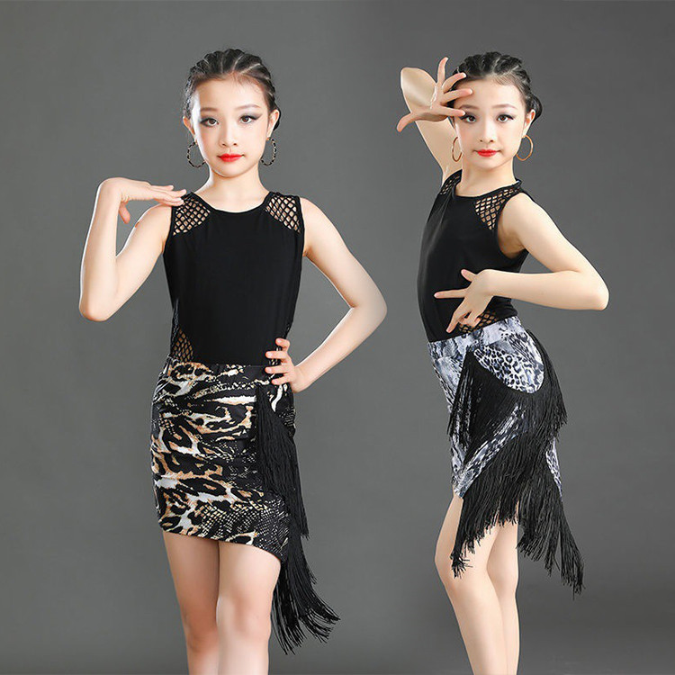 ラテン衣装 二点セット レオタード+スカート ブラック 蛇紋 トラ柄 社交ダンス キッズ 女の子 高級感 お洒落 豪華 パーティー ラテンダンス 発表会 舞台 競技 練習 演出 ステージ wudao-