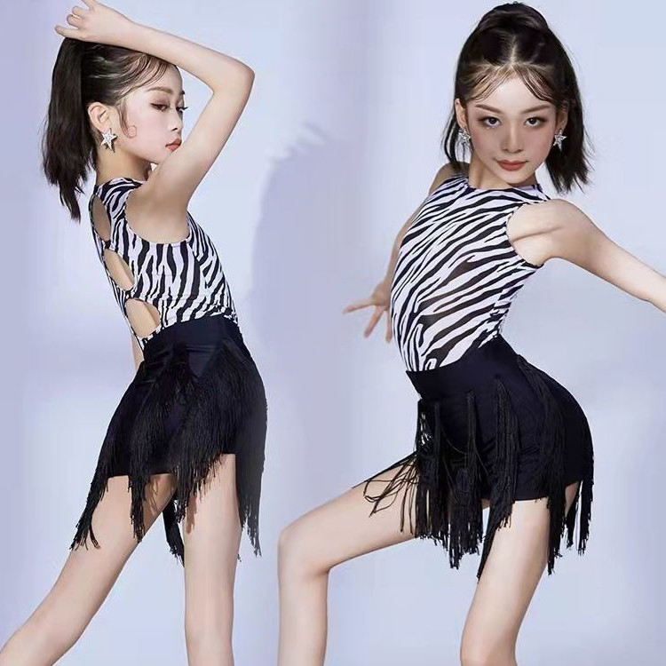 ラテンダンス 二点セット レオタード+スカート 社交ダンス キッズ ラテン 女の子 ダンスウェア latin 肩出し 発表会 舞台 競技 練習 演出 ゼブラ柄 タッセル 110~170cm wudao