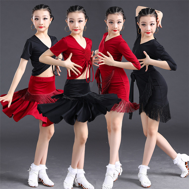 ラテンダンス 二点セット ワンピース 社交ダンス キッズ ラテン おしゃれ タッセル 女の子 ダンスウェア latin 発表会 舞台 競技 練習 演出 高級感 ブラック ワインレッド wudao-52