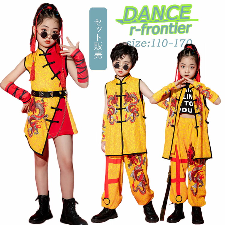 キッズ ダンス衣装 セットアップ ダンス衣装 チャイナ風 イエロー ジャズ イベント 龍柄 民族風 演出服 hiphop 中国風 110-170
