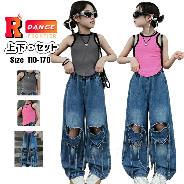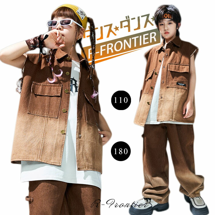 茶色 ベスト ダンス衣装 デニムパンツ 女の子 ヒップホップ キッズ セットアップ 男の子 ジャズダンス かっこいい 絞り染め 韓国 団体 HIPHOP イベント 120 130 140 150 16