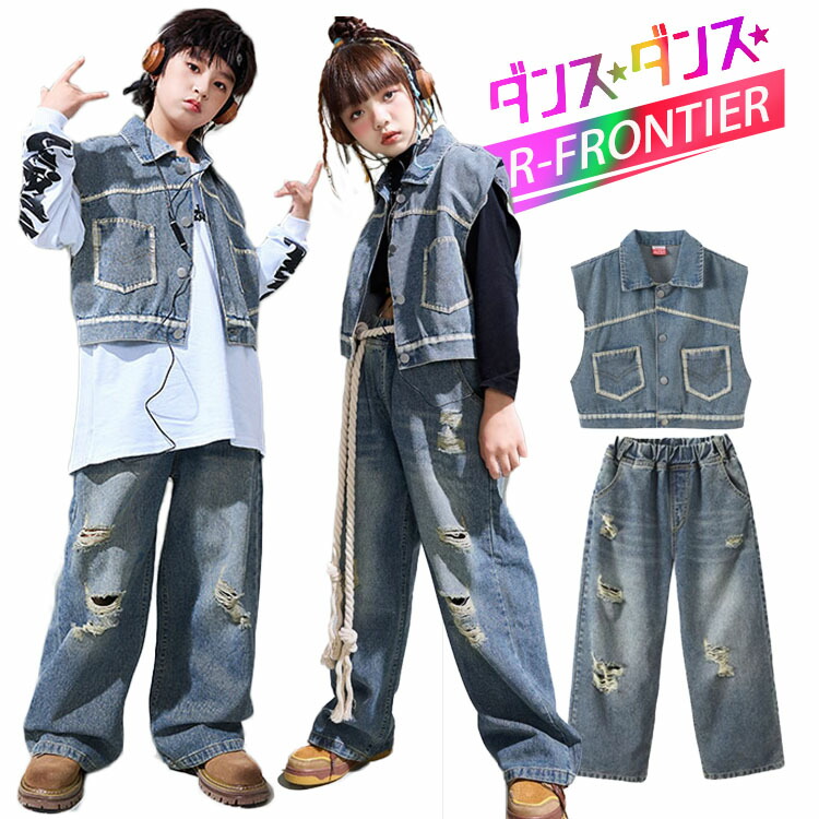 ダンス衣装 キッズ デニム セットアップ ダメージパンツ ベスト 男の子 女の子 ガールズ 韓国 セットアップ 演出服 応援団 練習着 110 180