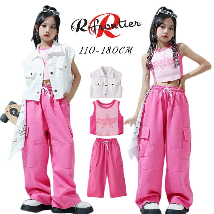 ダンス トップス へそ出し キッズ 女の子 ピンク カーゴパンツ かっこいい セットアップ ヒップホップ ワイドパンツ 韓国 -衣装 子供 イベント 発表会 演出服 110 18