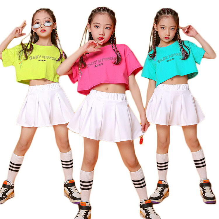 キッズ ダンス衣装 セットアップ 女の子 へそ出しトップス 白スカート チアダンス衣装 韓国 -衣装 ヒップホップ 上下セット 子供 ダンス衣装 100 110 120 130