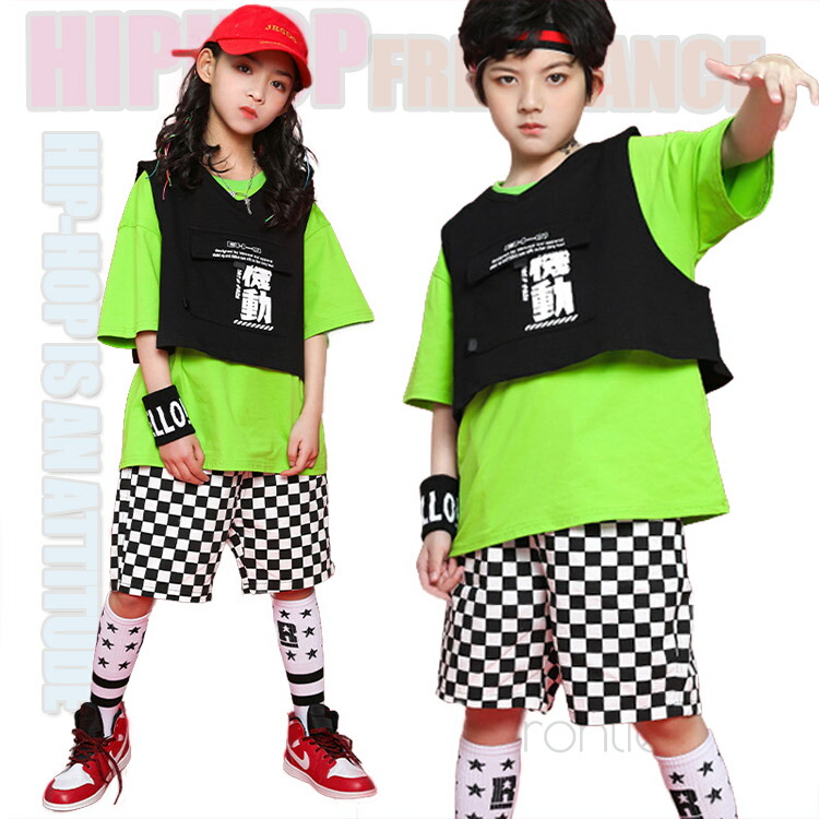 ダンス衣装 キッズ セットアップ ベスト 半袖 チェック柄 パンツ ジャズダンス ガールズ 韓国 ヒップホップ hiphop ヒップホップ 演出服 応援団 練習着 110 180