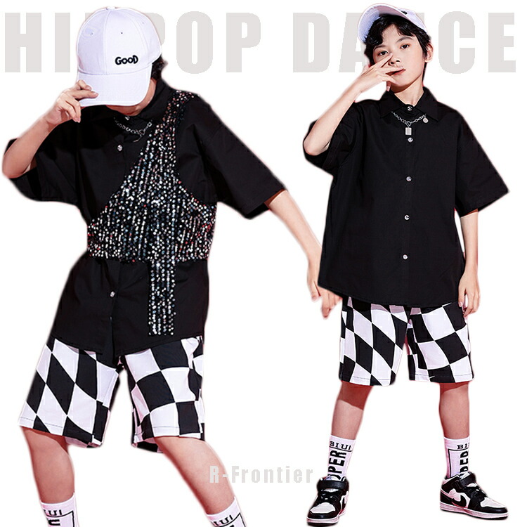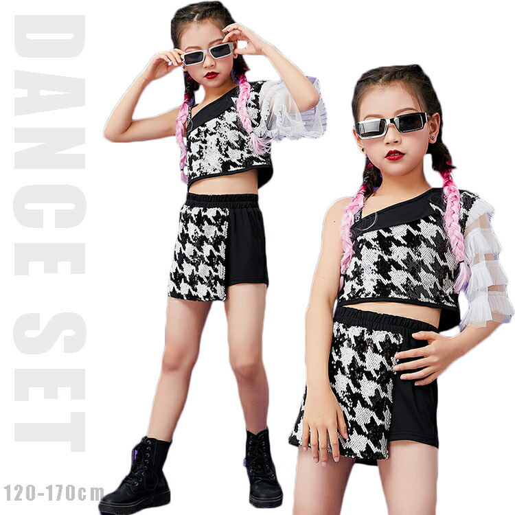 キッズ ダンス 衣装 スパンコール 千鳥柄 セットアップ ヒップホップ ジャッズダンス - 120 130 140 150 160 170