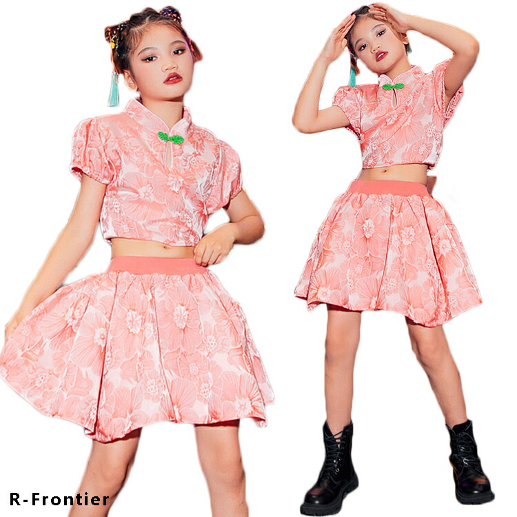 キッズ ダンス 衣装 ジャズダンス へそ出し トップス スカート チャイナダンス ヒップポップ ピンク 110 120 130 140 150 160 170
