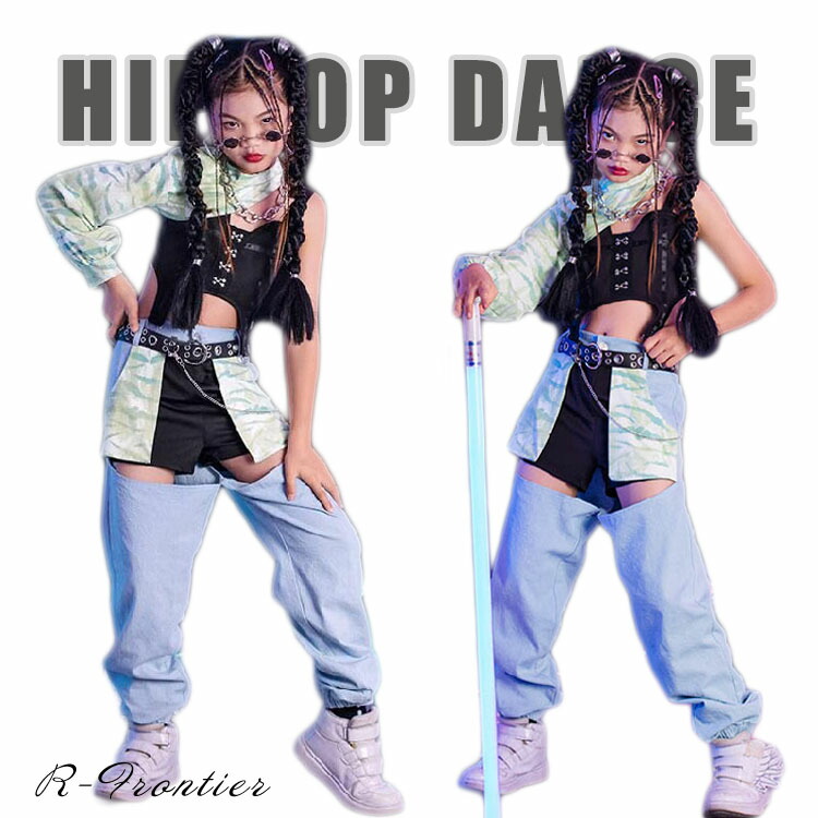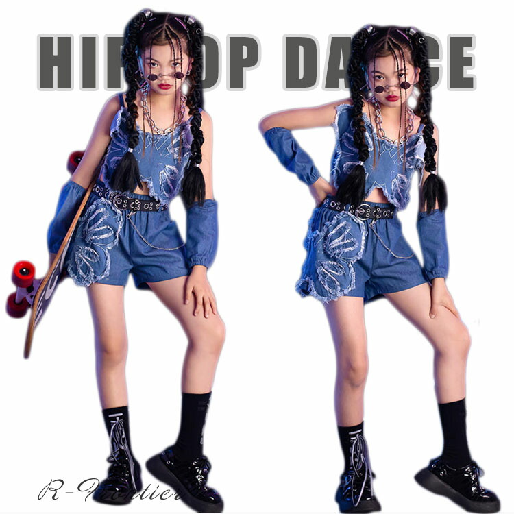 キッズダンス衣装 セットアップ へそ出し トップス デニムシャツ 女の子 ヒップホップ ジャズダンス ジュニア 韓国 団体 HIPHOP 小学生 発表会 イベント 120 130 140 150 16