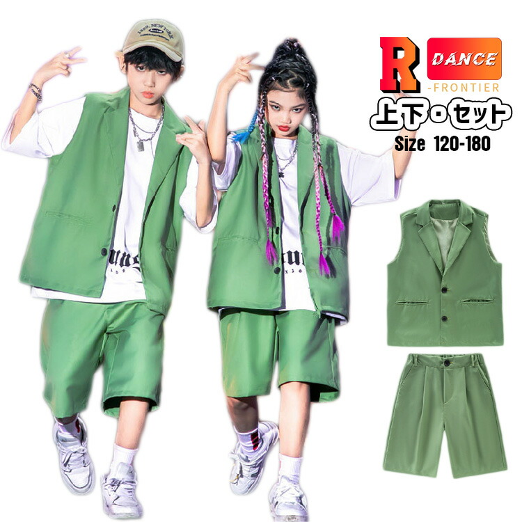 キッズ ダンス衣装 セットアップ 緑 ダンススーツ ヒップホップ 女の子 男の子 ベスト 韓国 -衣装 かっこいい ジャズダンス ジュニア 子供 ダンス衣装 発表会 演出服 12