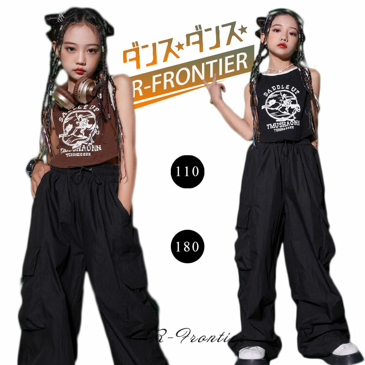 キッズ ダンス衣装 セットアップ へそ出し トップス 女の子 黒 パンツ ヒップホップ 韓国 かっこいい 茶色 演出服 ジュニア 子供 HIPHOP イベント 発表会 演出服 応援 110 180