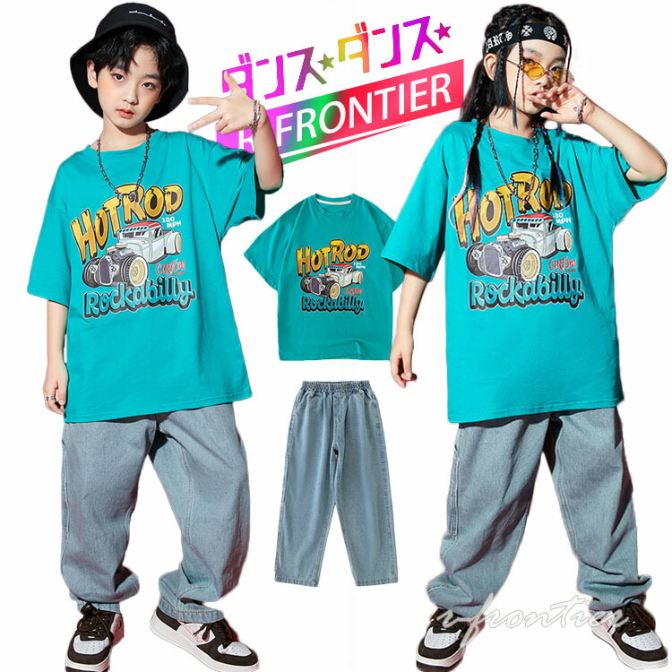 ダンス衣装 キッズ セットアップ デニムパンツ 水色 tシャツ ダンスパンツ ゆったり ヒップホップ 団体 HIPHOP ダンス衣装 女の子 男の子 イベント 110 120 130 140 150