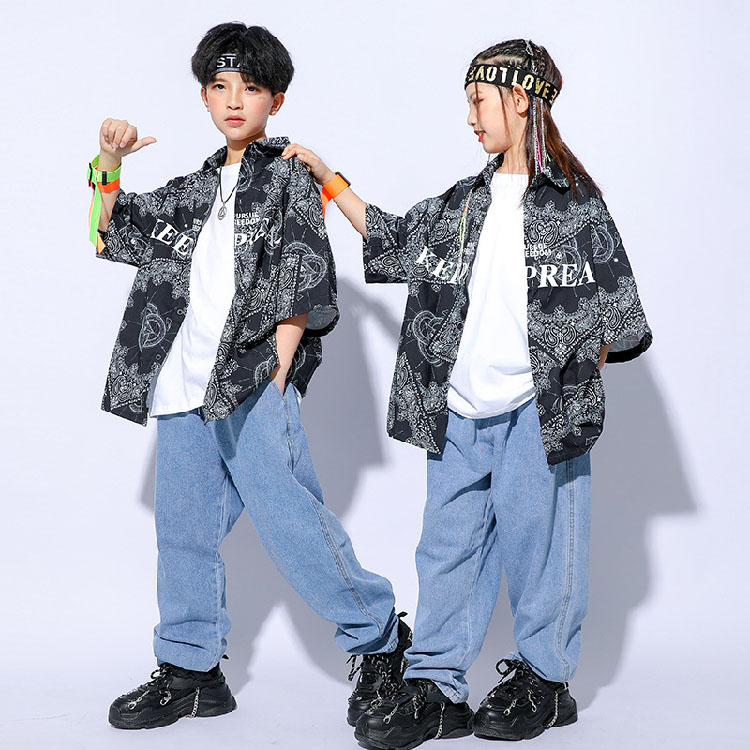 ダンス 衣装 ヒップホップ キッズ 花柄シャツ デニム パンツ 女の子 男の子 セットアップ 韓国 ジャズダンス かっこいい 子供 HIPHOP 演出服 発表会 イベント 120 130 140 15