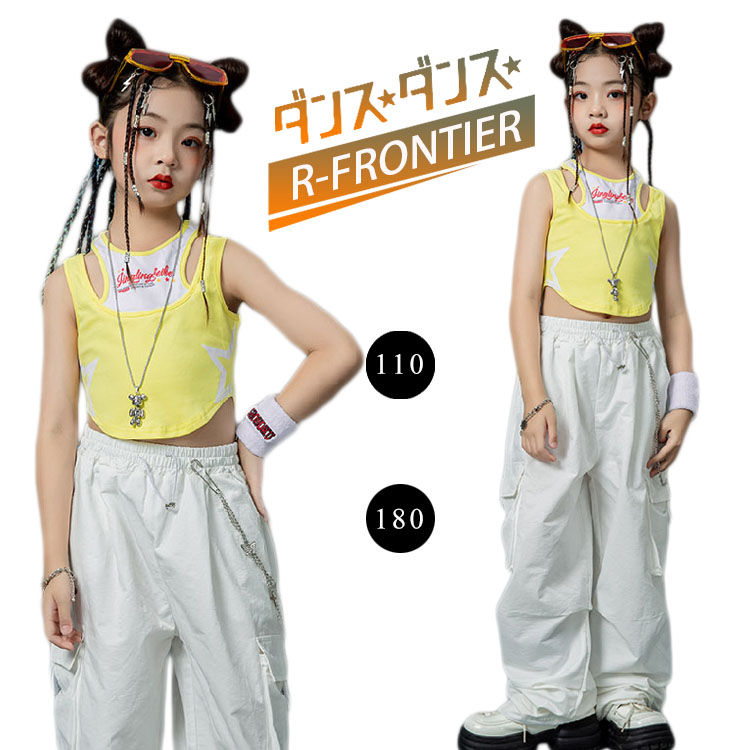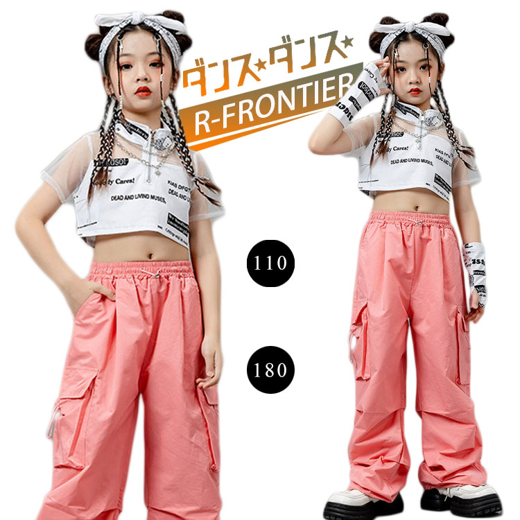 キッズ ダンス衣装 女の子 へそ出し トップス 白 パンツ セットアップ カーゴパンツ ヒップホップ 韓国 -衣装 かっこいい 演出服 ジュニア 子供 イベント 発表会 応援 1