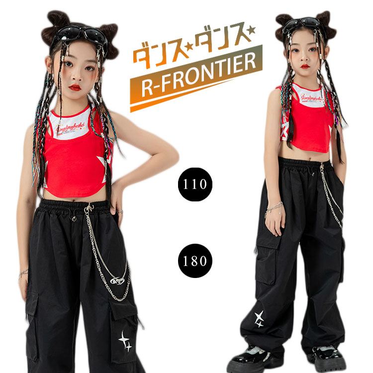 キッズダンス衣装 女の子 へそ出し トップス 赤 黒 セットアップ カーゴパンツ ヒップホップ 韓国 -衣装 かっこいい 演出服 ジュニア 子供 イベント 発表会 応援 110