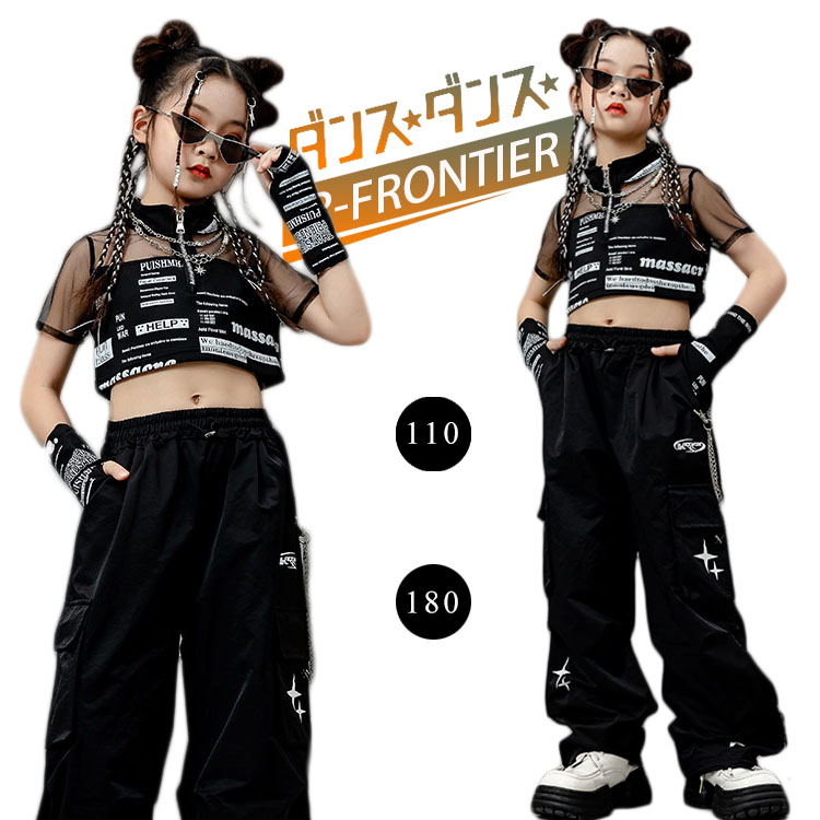キッズ ダンス衣装 セットアップ 女の子 へそ出し トップス 黒シャツ ヒップホップ 韓国 -衣装 かっこいい 演出服 ジュニア 子供 イベント 発表会 演出服 応援 110 1