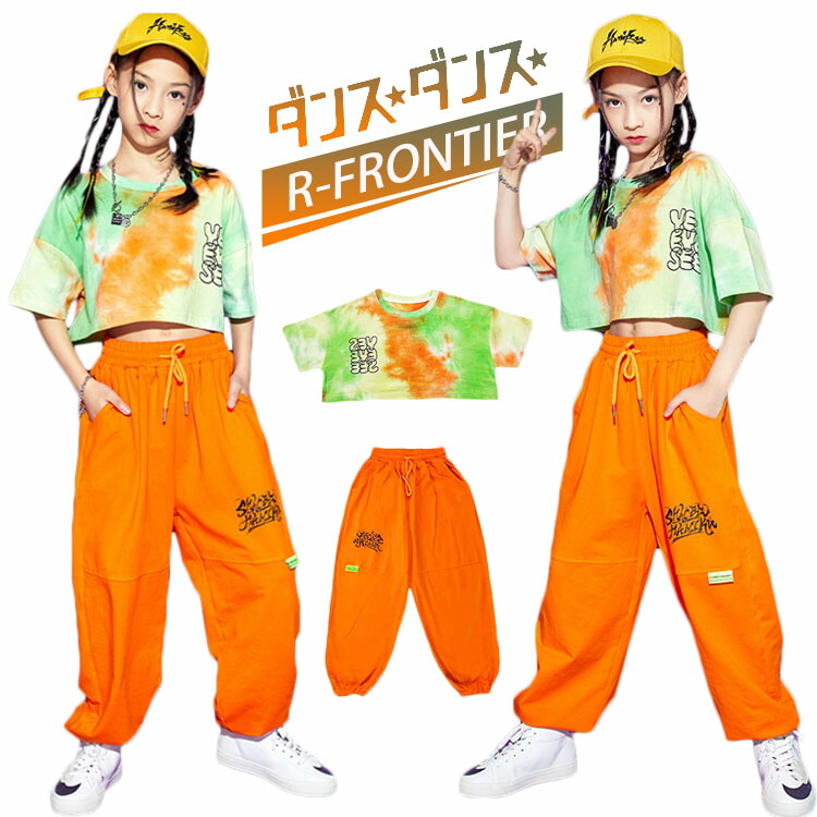 ダンス トップス へそ出し キッズ オレンジパンツ 女の子 絞り染めシャツ セットアップ 韓国 -衣装 ヒップホップ チアダンス 子供 イベント 発表会 演出服 団体服 110