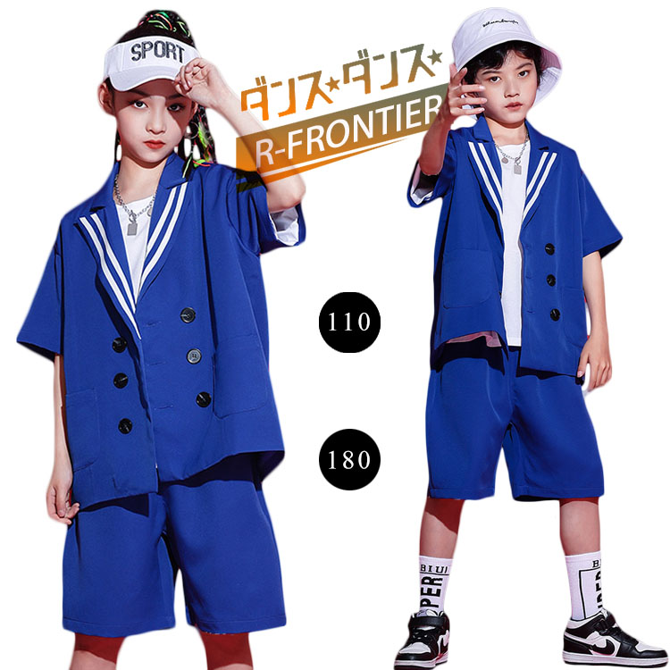 ダンス衣装 ヒップホップ キッズ 青 ダンススーツ かっこいい 女の子 男の子 セットアップ 韓国 -衣装 ハーフパンツ ジャズダンス 子供服 イベント 演出服 110 180