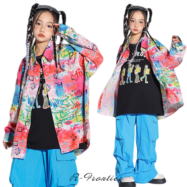 キッズ ダンス 衣装 ヒップホップ 柄シャツ パンツ へそ出し 子供 女の子 ジャズダンス 発表会 文化祭 演出服120 130 140 150 160 170