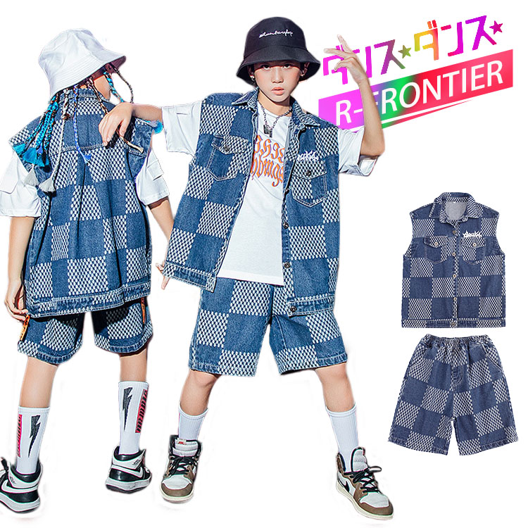 ダンス衣装 キッズ デニム チェック柄 ヒップホップ ベスト ズボン 夏 HIPHOP 子供 男の子 女の子 ステージ衣装 団体服 発表会 演出服 韓国 カッコイイ