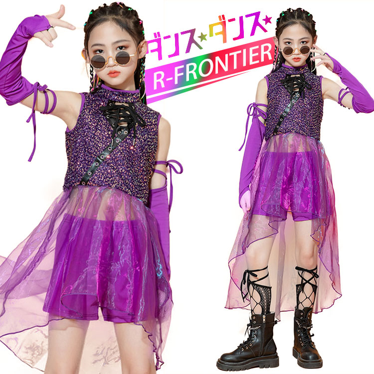 ダンス衣装 キッズ セットアップ ジャズダンス スパンコール キラキラ ガールズ チアガール 演出服 応援団 練習着 110 170 チュール パープル ヒップホップ