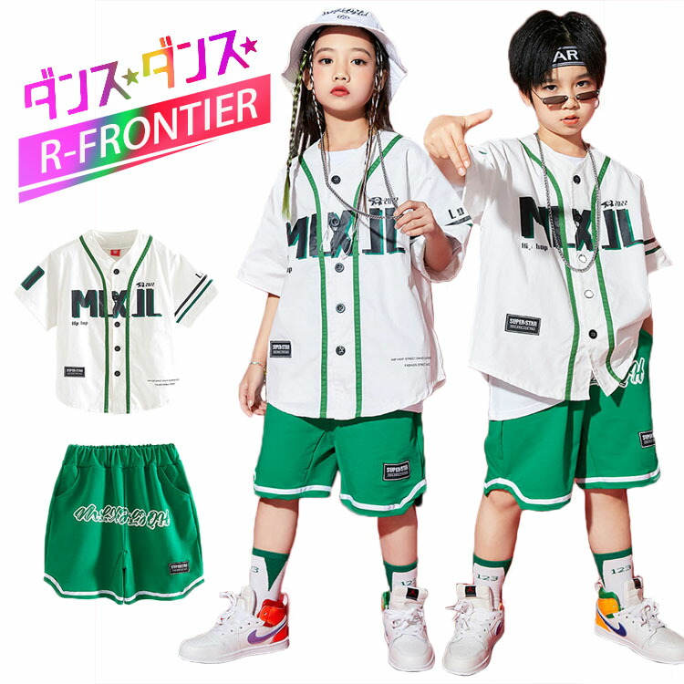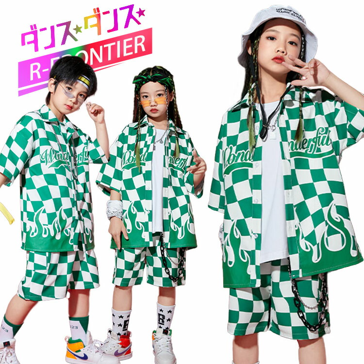 ダンス衣装 キッズ シャツ 半袖 半ズボン ヒップホップ グリーン トップス ズボン 夏 子供 男の子 女の子 ステージ衣装 団体服 発表会 演出服 韓国