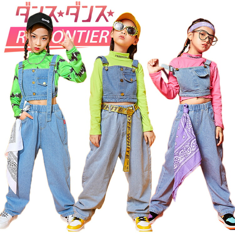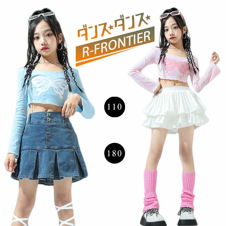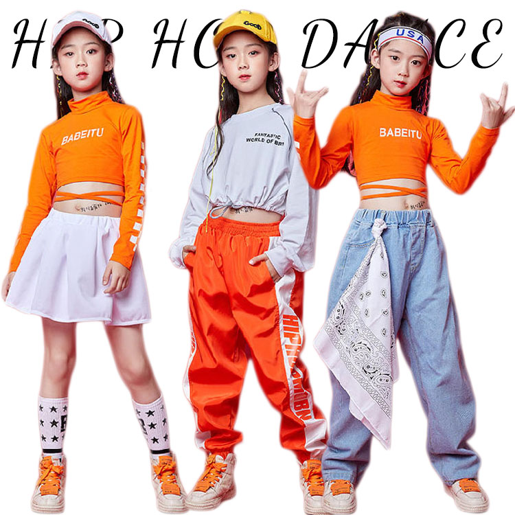 ダンス トップス へそ出し キッズ 女の子 セットアップ かっこいい 長袖 韓国 -衣装 ヒップホップ ジャズダンス デニムパンツ 白スカート 演出服 イベント 発表会 応援 110-180