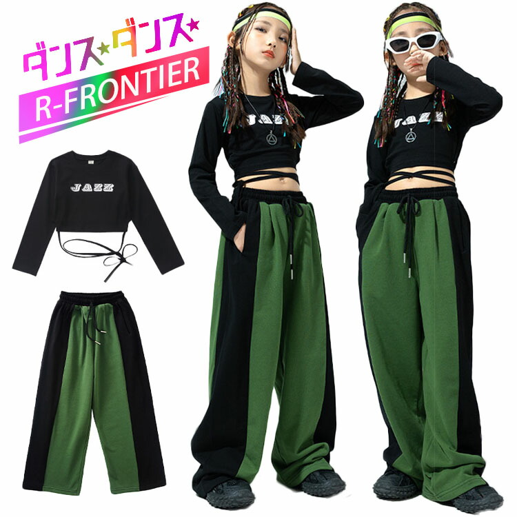 ダンス衣装 キッズ へそ出しトップス 黒 グリーンパンツ ダンスパンツ ゆったり ジャズダンス 女の子 ガールズ 韓国 セットアップ 演出服 応援団 練習着 110 180