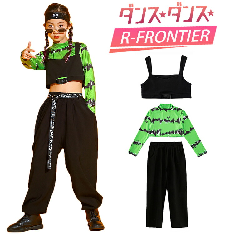 ダンス衣装 キッズ へそ出しトップス 黒 グリーンパンツ ダンスパンツ ゆったり ジャズダンス 女の子 ガールズ 韓国 hiphop セットアップ 演出服 応援団 練習着 110 180