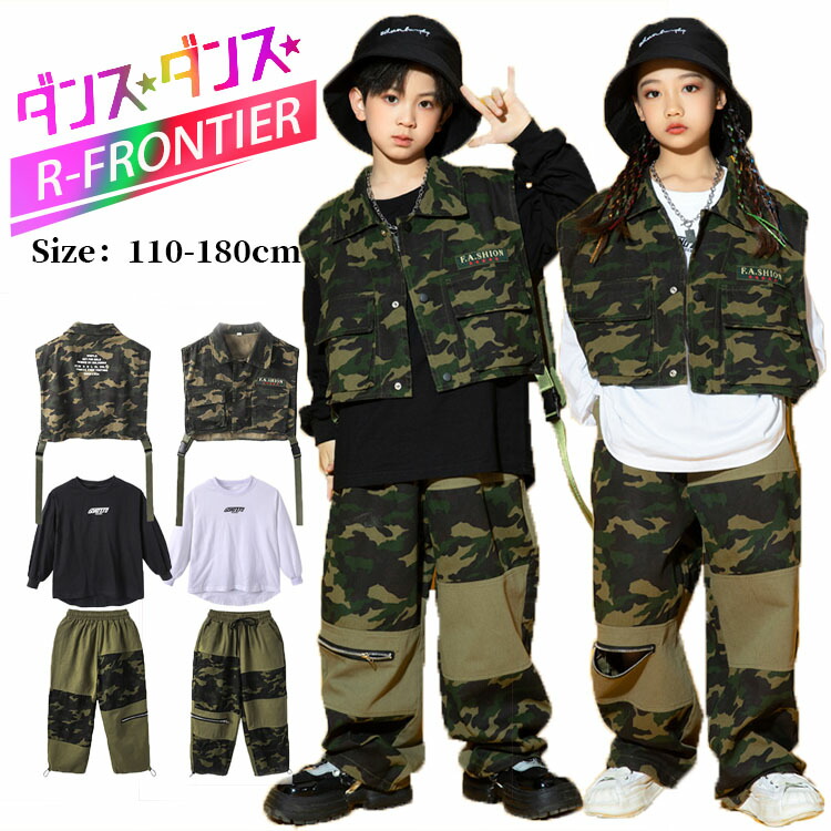 キッズ ダンス 衣装 セットアップ ヒップホップ 迷彩 ベスト カーゴパンツ ユニセックス カッコイイ ヒップホップ 長ズボン 子供 女の子 ステージ衣装 団体服 発表会 演出服 韓国