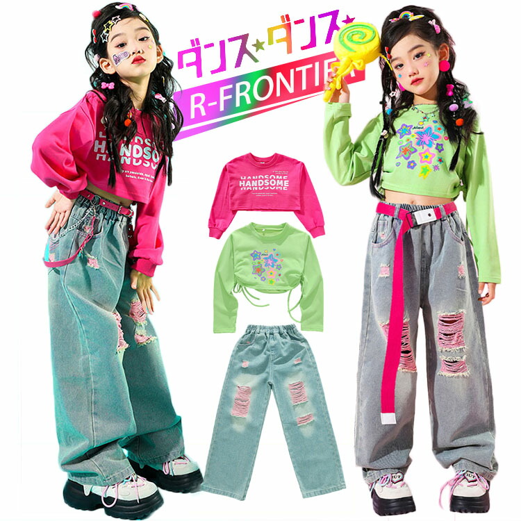 ダンス衣装 キッズ 女の子 セットアップ デニムパンツ へそ出しトップス ダメージ ダンスパンツ ヒップホップ ジャズダンス ガールズ 演出服 応援団 ステージ衣装 110-180