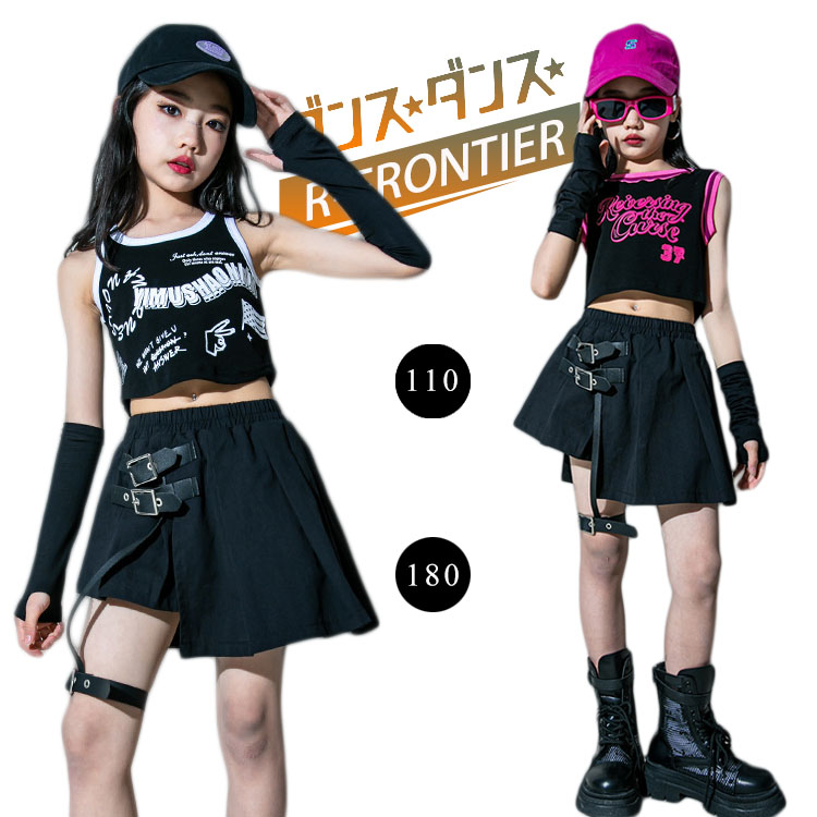 キッズ ダンス衣装 セットアップ へそ出し トップス 女の子 黒スカート チアダンス衣装 韓国 k-pop衣装 かっこいい 演出服 ジュニア 子供 HIPHOP イベント 発表会 演出服 応援 110