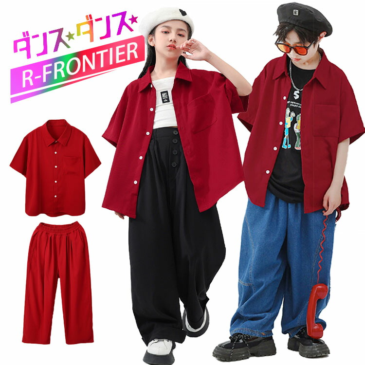 キッズ ダンス衣装 デニムパンツ 半袖シャツ デニムパンツ 赤 ユニセックス 男女兼用 ジャズダンス ガールズ 韓国 ヒップホップ セットアップ 演出服 応援団 練習着 110 180