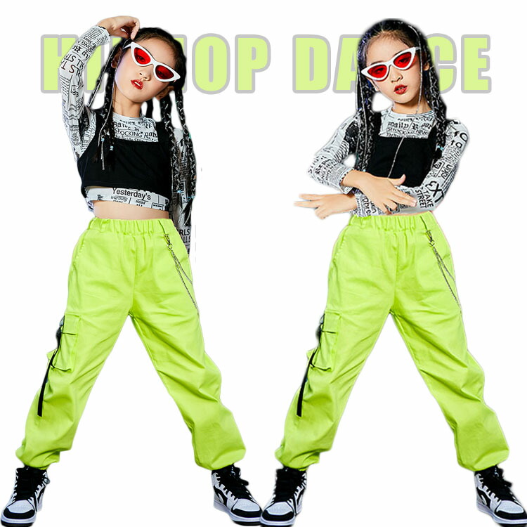 キッズ ダンス衣装 へそ出し トップス 緑パンツ ヒップホップ 女の子 ジャズダンス 長袖 セットアップ 韓国 k-pop衣装 団体 HIPHOP 応援団 イベント 発表会 演出服 120-170cm