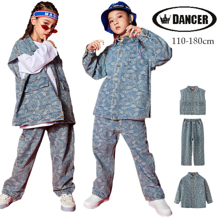 デニムセットアップ ヒップポップ -衣装 キッズ ダンス 衣装 デニム 上下セット 派手 デニム 総柄 ユニセックス ベスト 長袖シャツ 選べる2タイプ 110 120 130 140 150