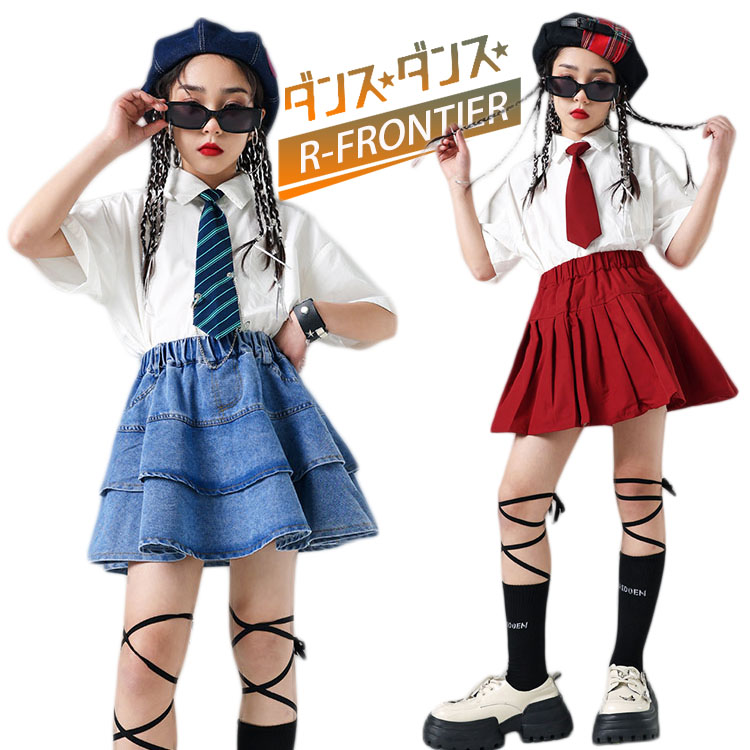 キッズ ダンス衣装 セットアップ 女の子 赤スカート 黒 デニムスカート 白シャツ 韓国 k-pop衣装 かっこいい チアダンス衣装 半袖 舞台服 発表会 応援団 団体服 120-170cm