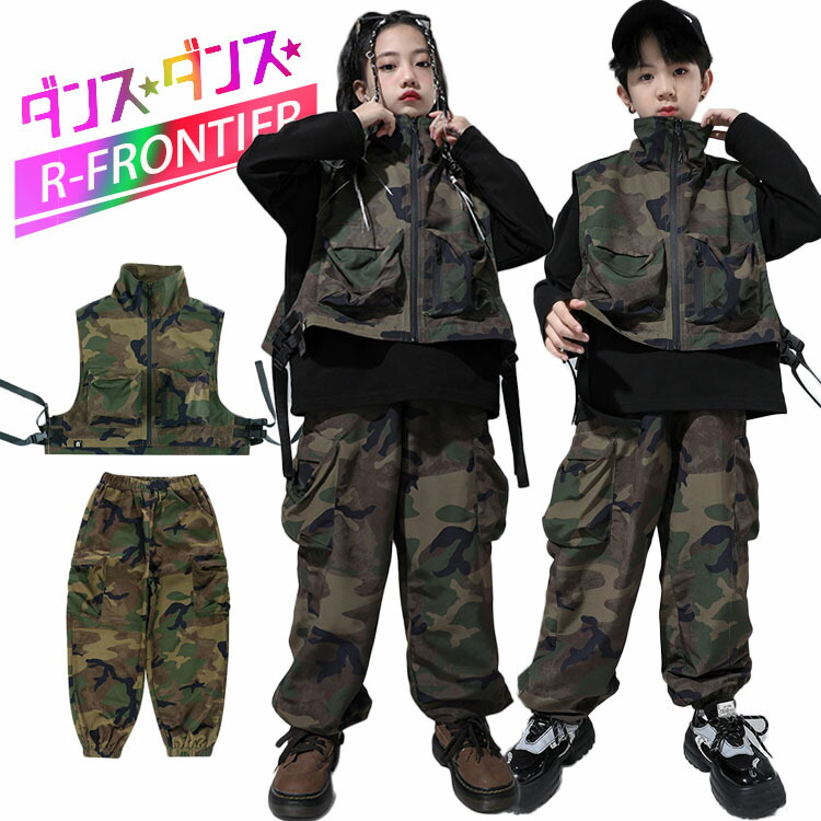 ダンス衣装 キッズ セットアップ 迷彩柄 ベスト カーゴパンツ カッコイイ ヒップホップ 長ズボン HIPHOP 子供 女の子 ステージ衣装 団体服 発表会 演出服 韓国