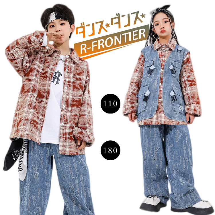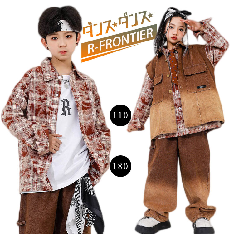 柄シャツ 茶色 ベスト 絞り染め キッズ ダンス衣装 セットアップ デニムパンツ ヒップホップ 女の子 男の子 韓国 -衣装 子供服 ジャズダンス ステージ衣装 イベント 110-180