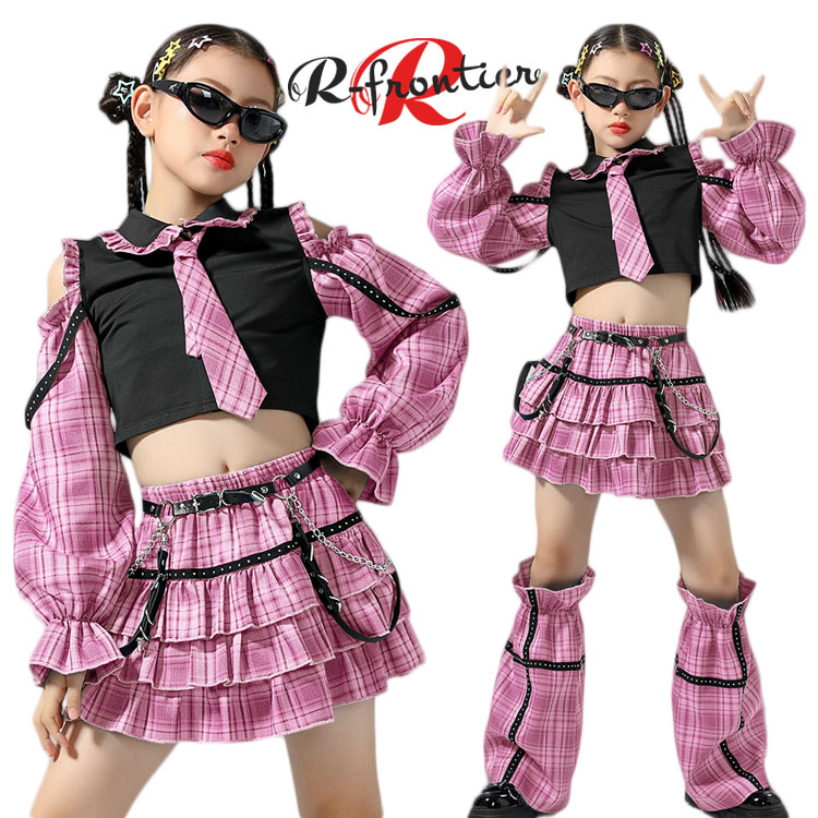 ダンス トップス へそ出し キッズ 女の子 チェック柄スカート レッグカバー 韓国 k-pop衣装 かっこいい チアダンス衣装 長袖 舞台服 発表会 応援団 団体服 120-170cm