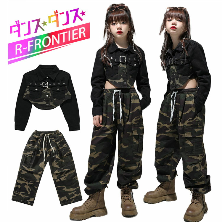 ダンス衣装 キッズ セットアップ 迷彩柄 トップス カーゴパンツ カッコイイ ヒップホップ 長ズボン 子供 女の子 ステージ衣装 団体服 発表会 演出服 韓国