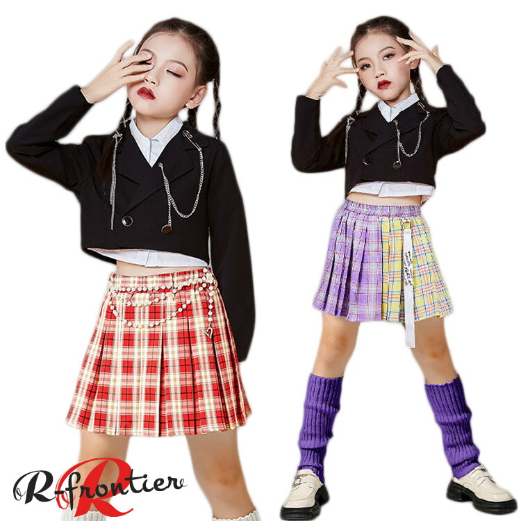 ダンス トップス へそ出し キッズ 女の子 紫 赤 チェック柄スカート 白シャツ 韓国 -衣装 かっこいい チアダンス衣装 長袖 舞台服 発表会 応援団 団体服 120-170