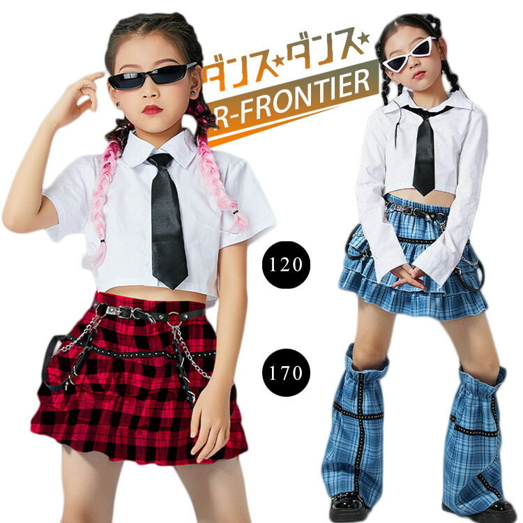 ダンス トップス へそ出し キッズ 女の子 青 赤 チェック柄スカート 白シャツ 韓国 k-pop衣装 かっこいい チアダンス衣装 半袖 長袖 舞台服 発表会 応援団 団体服 120-170cm