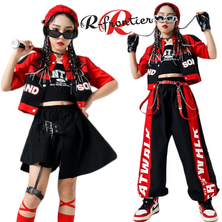 ダンス トップス へそ出し キッズ 女の子 かっこいい 赤ジャケット スカート 黒パンツ 長袖 ヒップホップ 韓国 k-pop衣装 ジャズダンス 団体 HIPHOP 演出服 応援団 イベント110-1