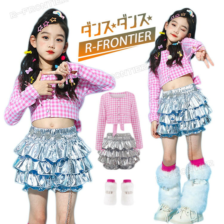 ダンス衣装 ヒップホップ キッズ 女の子 シルバースカート かっこいい セットアップ ジャズダンス 韓国 -衣装 チェック柄シャツ 子供 イベント 発表会 演出服 応援 110
