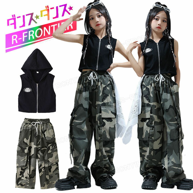 女の子 ダンス衣装 キッズ カーゴパンツ 袖無しトップス 黒タンクトップ ゆったり パンツ ヒップホップ 団体 HIPHOP イベント 110 120 130 140 150 160 170 180