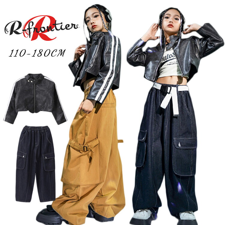 ダンス衣装 ヒップホップ キッズ 女の子 レザージャケット デニムパンツ かっこいい 長袖 セットアップ ワイドパンツ 韓国 k-pop衣装 子供 HIPHOP イベント 発表会 演出服 110 18