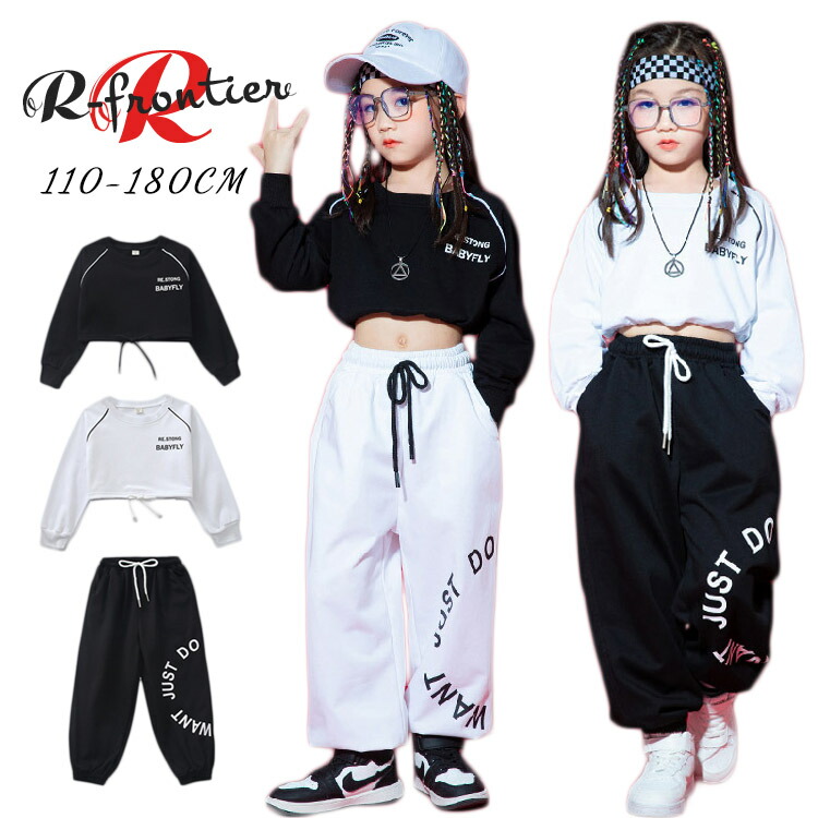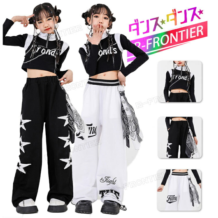 ダンス トップス へそ出し キッズダンス衣装 女の子 ヒップホップ セットアップ 白tシャツ 黒 パンツ かっこいい ジャズダンス 韓国 k-pop衣装 子供 イベント 発表会 演出服 110 180