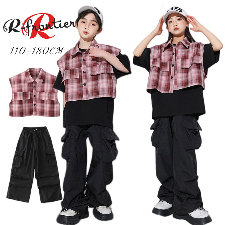 キッズ ダンス衣装 ヒップホップ 女の子 男の子 チェック柄 ベスト かっこいい セットアップ 韓国 k-pop衣装 ジュニア 子供 HIPHOP イベント 発表会 演出服 応援 110 180